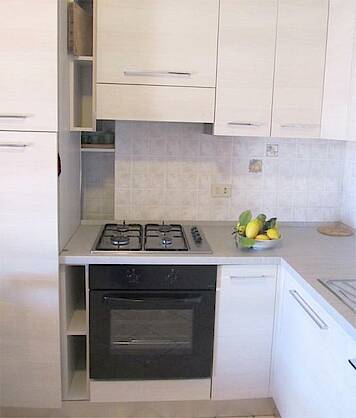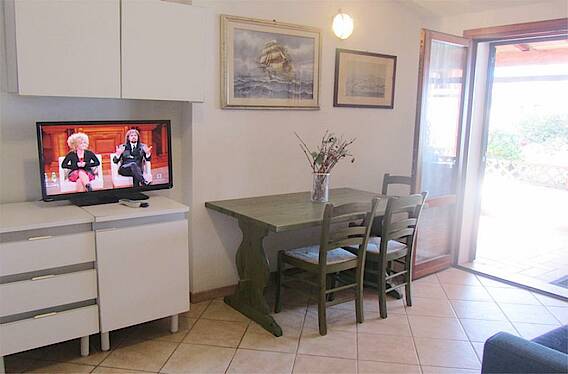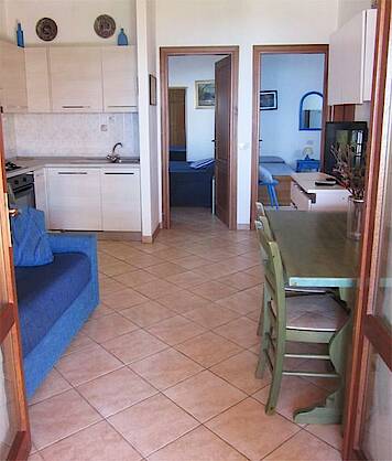 Die komplett eingerichtete Wohnung bietet ein Wohnzimmer mit einer Sitzecke und TV, verbunden durch zwei Türen mit einem Doppelschlafzimmer und einem Zweibettzimmer und einem Badezimmer mit Dusche. Von dem Wohnraum mit Schlafcouch, Küchenzeile und Speiseecke gelangt man auf die möblierte Terrasse von der man auf das Meer sehen kann.