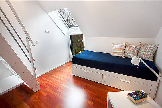 Integriert im Wohn- und Essbereich befinden sich in zwei Ebenen, der Ausblick ins Grüne ist hiermit auch aus dem rückwärtigen Teil des Gebäudes möglich und durch die großzügigen Eckfenster wird der Blick in die Natur ermöglicht. Große Holzterrassen erweitern den Wohnraum in den Außenbereich.