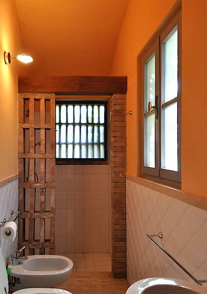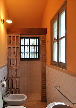 Man gelangt durch die Loggia in den geräumigen Wohnraum mit Küchenzeile, weiter durch ein Zweibettzimmer in ein geräumiges Doppelzimmer das sich im antiken Teil des Hauptgebäudes befindet und Fenster in beide Gebäuderichtungen besitzt. Ein Badezimmer mit Dusche und einem schönen Blick in die Hügellandschaft.