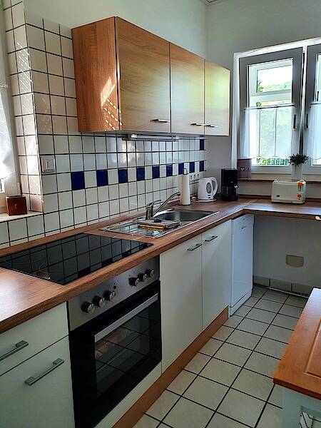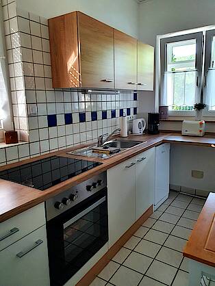 Die moderne Einbauküche ist mit einem Elektroherd mit Ceranfeld und Backofen, Kochtöpfen, Porzellan, Gläsern, Bestecken, Kaffeemaschine, Mikrowelle, Toaster, Spülmaschine etc. komplett ausgestattet.