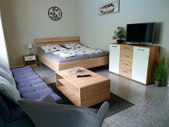 Das Haus hat ein großes Wohn/Schlafzimmer mit Sitzecke und einen kleinen Wintergarten.