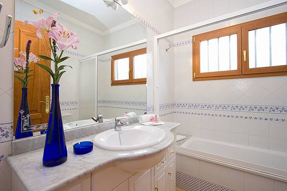 * 3 bedrooms: 1 with double bed and 2 with two single beds in each. * 2 bathrooms, one with shower and one with bath, fully -equipped kitchen (dishwasher, oven, microwave, vitroceramic). * Utility room with washing machine, iron, ironing board, small patio, dining lounge with table for 6 persons, sat-TV, DVD upon request, decorated with warm colours. Terrace with parcial view to the ocean, large swimming pool of salt water, solarium, sunloungers, table, chairs, BBQ, and parking. Wifi system.
